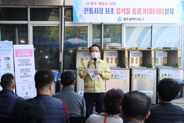 µ¿±¸´Â ÃÖ±Ù Àü±¹¿¡¼ óÀ½À¸·Î ³²±¤ÁÖÇØ¶ß´Â½ÃÀå¿¡ À½½Ä¹°Ã³¸®Á¾·®±â¸¦ ¼³Ä¡Çß´Ù. À½½Ä¹°Ã³¸®Á¾·®±â´Â ¹«¼±Á֯ļö¸¦ ÀÌ¿ëÇØ ´ë»óÀ» ½Äº°ÇÏ´Â ÀåÄ¡·Î ¹èÃâÄ«µå¸¦ ÀνÄÇØ »ç¿ëÀÚÁ¤º¸¸¦ È®ÀÎÇϰí À½½Ä¹° ¾²·¹±â¹«°Ô¸¦ °è»ê, ¹èÃâÇÑ ¸¸Å ¼ö¼ö·á¸¦ ºÎ°úÇÏ´Â ¹æ½ÄÀÌ´Ù.