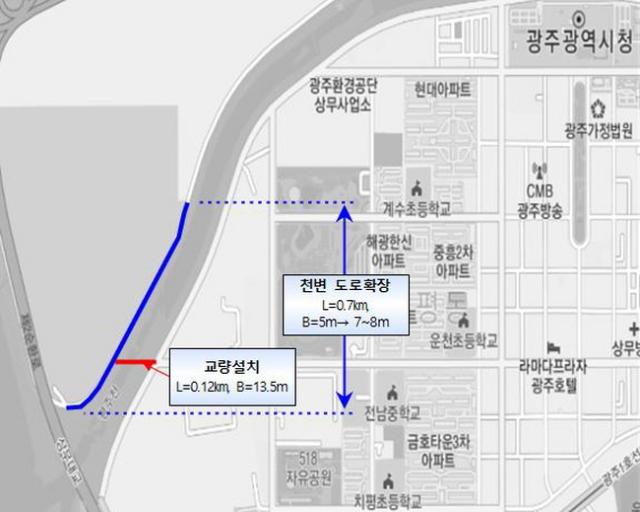 ±¤ÁÖ±¤¿ª½Ã´Â Áö³ 2018³â 5¿ùºÎÅÍ ¿¬Àå 0.12§°, Æø¿ø 13.5m, ¿Õº¹ 2Â÷¼± ±Ô¸ðÀÇ ±¤ÁÖõ Ⱦ´Ü ±³·®À» ¼³Ä¡Çϰí, ¿¬Àå 0.7§°ÀÇ Ãµº¯µµ·Î¸¦ È®ÀåÇÏ´Â °ø»ç¸¦ 2³â¿©¿¡ °ÉÃÄ ÃßÁøÇؿԴÙ.