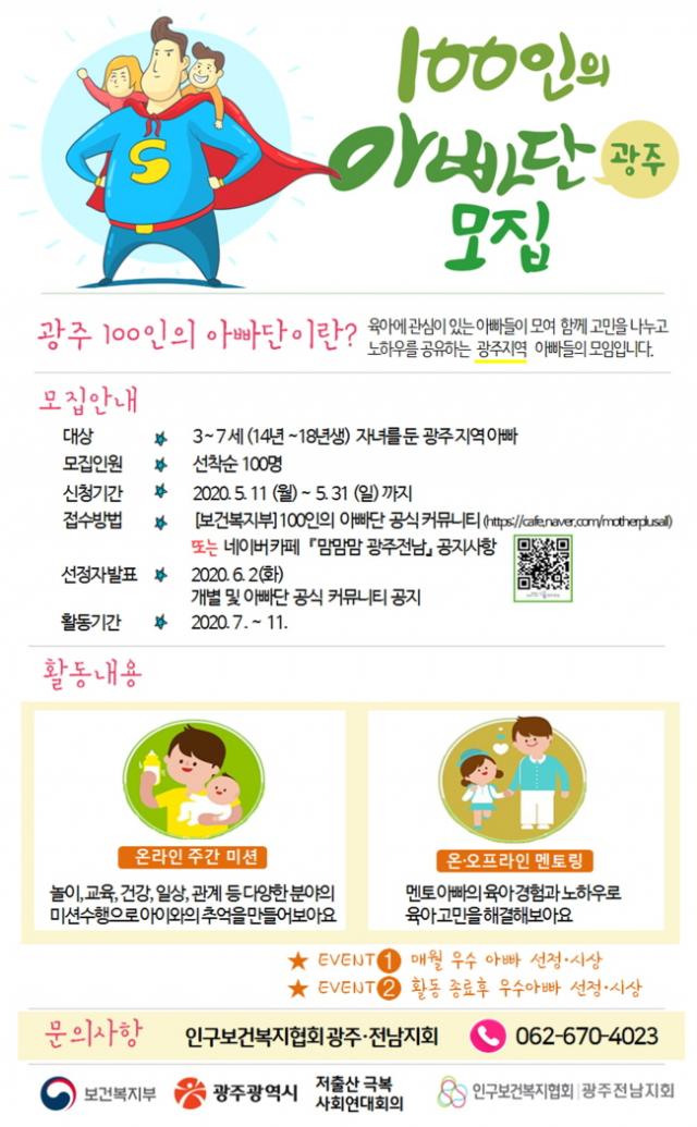 ½Åû¹æ¹ýÀº º¸°Çº¹ÁöºÎ 100ÀÎÀÇ ¾Æºü´Ü °ø½Ä Ä¿¹Â´ÏƼ »çÀÌÆ®(https://cafe.naver.com/motherplusall)ÀÇ ±¤ÁÖÁö¿ª°Ô½ÃÆÇ ¶Ç´Â ³×À̹öÄ«Æä¡®¸¾¸¾¸¾ ±¤ÁÖÀü³²¡¯ °øÁö»çÇ×À» ÅëÇØ ½Åû¼¸¦ Á¦ÃâÇÏ¸é µÈ´Ù. ¼±Á¤µÈ Âü¿©ÀÚ´Â 6¿ù2ÀÏ °³º°°øÁö ¹× º¸°Çº¹ÁöºÎ Ä¿¹Â´ÏƼ¿¡ °Ô½ÃÇÒ ¿¹Á¤ÀÌ´Ù.