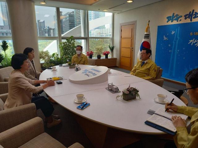 5¿ù 14ÀÏ ¸ñ¿äÀÏ ¿ÀÀü 11½Ã ½ÃÀå½Ç¿¡¼ ¸¸³ µÎ »ç¶÷Àº ±¤ÁÖÇü ÀÏÀÚ¸®¿Í Äڷγª19·Î ¾î·Á ¿öÁø Áö¿ª»óȲ µî¿¡ ´ëÇÑ ÀÌÇØ¸¦ °°ÀÌ Çϰí ÀÌÈÄ Àû±ØÀûÀÎ Çù·ÂÀ» ÇØ °¡±â·Î ÇÏ¿´´Ù.