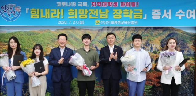 27ÀÏ Àü³²µµÃ» VIP½Ç¿¡¼ °¡Áø Áõ¼ ¼ö¿©½Ä¿¡´Â ±è¿µ·Ï Àü³²ÀÎÀçÆò»ý±³À°ÁøÈï¿ø ÀÌ»çÀå°ú ÃÖÀÏ µ¿½Å´ë ÃÑÀå, Àü³²µµ³» ´ëÇлý ´ëÇ¥ µîÀÌ Âü¼®ÇÑ °¡¿îµ¥ ÁøÇàµÆ´Ù. À̹ø ÀåÇбÝÀº º»ÀÎ ¶Ç´Â ºÎ¸ð°¡ 1³â ÀÌ»ó Àü³²¿¡ ÁÖ¼Ò¸¦ µÐ Çлýµé¿¡°Ô Áö±ÞµÇ¸ç, ÃÑ 20°³ ´ëÇÐ 6õ 476¸íÀ» ´ë»óÀ¸·Î 1Àδç 60¸¸¿ø¾¿ÀÌ Á¦°øµÈ´Ù.