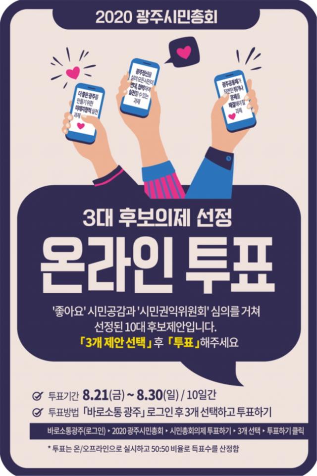 10´ë ¿¹ºñÀÇÁ¦´Â À̹ø ¿Â¡¤¿ÀÇÁ¶óÀÎ ½Ã¹ÎÅõÇ¥¸¦ °ÅÃÄ 3´ë Èĺ¸ÀÇÁ¦·Î ¼±Á¤µÇ¸ç, ¿À´Â 9¿ù12ÀÏ ¿¸± ¿¹Á¤ÀÎ 2020 ±¤ÁֽùÎÃÑȸ¡¯¿¡¼ ½Ã¹ÎÀÇ ¼÷ÀÇ¿Í Åä·Ð, ÅõÇ¥¸¦ ÅëÇØ ¡®±¤ÁÖ°øµ¿Ã¼ ½ÇõÀ» À§ÇÑ ÃÖÁ¾ÀÇÁ¦¡¯·Î ¼±Á¤µÈ´Ù.