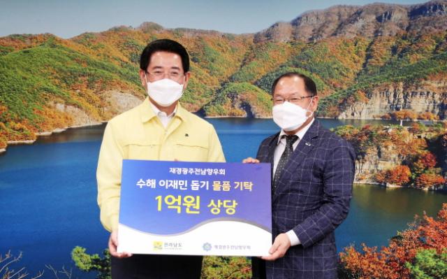 À̳¯ ÃÖ´ë±Ô Àç°æ±¤ÁÖÀü³²Çâ¿ìȸÀå°ú ÀåÆò¿.°À±¼º.¾ç±¤¿ë ¼ö¼®ºÎȸÀå µîÀº Àü³²µµÃ»À» ¹æ¹®, ±è¿µ·Ï Àü¶ó³²µµÁö»ç¿Í ¸é´ãÀ» °®°í ÁýÁßÈ£¿ì·Î ÇÇÇØ¸¦ °ÞÀº ±¸·Ê.°î¼º.´ã¾ç µî Áö¿ªÀÇ Á¶¼ÓÇÑ º¹±¸¿¡ ½á ´Þ¶ó¸ç 1¾ï ¿ø »ó´çÀÇ ¼öÇØº¹±¸ Áö¿ø¹°Ç°À» Àü´ÞÇß´Ù.