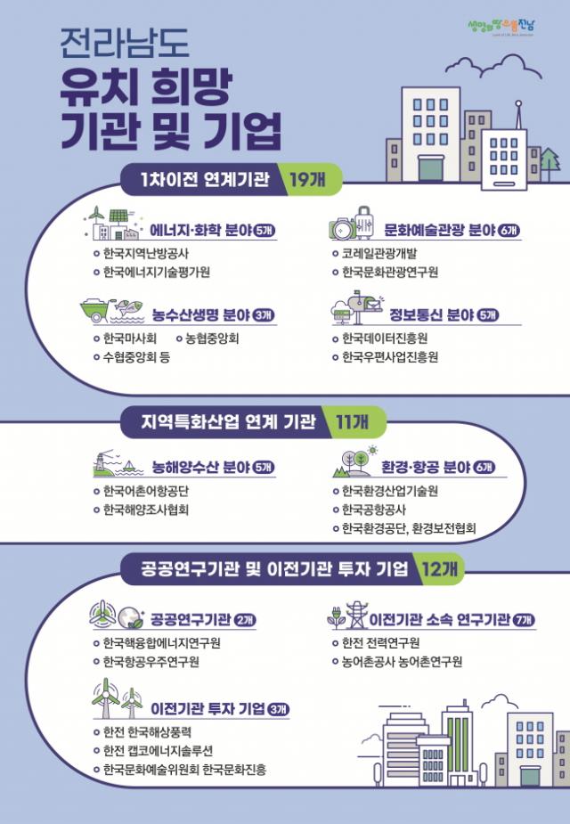 ¾ÕÀ¸·Î Àü¶ó³²µµ´Â 1Â÷ ÀÌÀü °ø°ø±â°ü°ú ¿¬°èÇØ Àü³²ÀÇ »õ·Î¿î ¹ßÀü±âȸ¸¦ ¸¸µé 19°³ ±â°üÀ¸·Î ¡ãÇѱ¹Áö¿ª³¹æ°ø»ç, Çѱ¹¿¡³ÊÁö±â¼úÆò°¡¿ø µî ¿¡³ÊÁö․ÈÇÐ ºÐ¾ß 5°³ ±â°ü ¡ãÇѱ¹¸¶»çȸ, ³óÇùÁß¾Óȸ, ¼öÇùÁß¾Óȸ µî ³ó¼ö»ê»ý¸í ºÐ¾ß 3°³ ±â°ü ¡ãÄÚ·¹Àϰü±¤°³¹ß, Çѱ¹¹®È°ü±¤¿¬±¸¿ø µî ¹®È¿¹¼ú°ü±¤ºÐ¾ß 6°³ ±â°ü ¡ãÇѱ¹µ¥ÀÌÅÍÁøÈï¿ø, Çѱ¹¿ìÆí»ç¾÷ÁøÈï¿ø µî Á¤º¸Åë½Å ºÐ¾ß 5°³ ±â°üÀ» À¯Ä¡ÇÒ °èȹÀÌ´Ù.