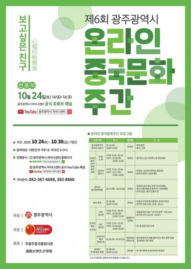 ±¤Áֽð¡ ÁÖÃÖÇϰí Â÷À̳ª¼¾ÅͰ¡ ÁÖ°üÇϸç, ÁÖ±¤ÁÖ Áß±¹ÃÑ¿µ»ç°üÀÌ ÈÄ¿øÇÏ´Â À̹ø Çà»ç´Â ¡®º¸°í ½ÍÀº Ä£±¸¡¯¶ó´Â ÁÖÁ¦·Î Áß±¹ ¾ð¾î¹®È°æÁø´ëȸ, Áß±¹¹®ÈüÇè, ºñ´ë¸é(·£¼±) Ư°, »çÁø °ø¸ðÀü µî ´Ùä·Î¿î ÇÁ·Î±×·¥ÀÌ ÁøÇàµÈ´Ù.
