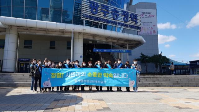 Ä·ÆäÀο¡ Âü°¡ÇÑ ±¤ÁÖ½Ã¿Í ±¤Áֱǿª °ø°ø±â°ü, ¹ÝºÎÆÐ±¹¹Î¿îµ¿ ±¤ÁÖ±¤¿ª½Ã¿¬ÇÕȸ µî °ü°èÀÚ 30¿© ¸íÀº Äڷγª 19 È®»ê ¹æÁö¸¦ À§ÇÑ ¹æ¿ª¼öÄ¢À» ÁؼöÇÏ¸é¼ ¡®Ã»·Å ! ½Ã¹Î°úÀÇ ¼ÒÁßÇÑ ¾à¼ÓÀÔ´Ï´Ù¡¯ ·Î°í°¡ ºÎÂøµÈ û·Å ¸¶½ºÅ©¿Í °ø°øÀçÁ¤ ȯ¼ö¹ý È«º¸ ¸®Çø´ µîÀ» ¹èºÎÇß´Ù.