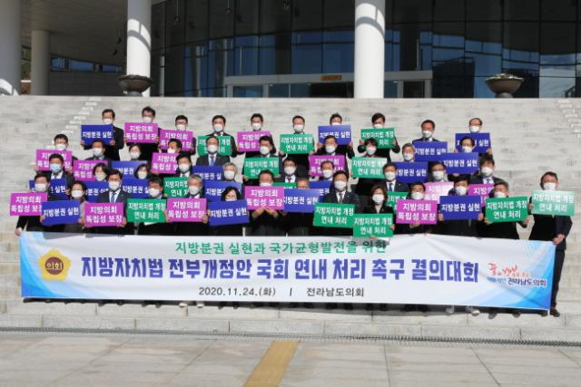 Àü³²µµÀÇȸ ÀÇ¿øµéÀº À̳¯ Á¤·Êȸ 2Â÷ º»È¸ÀÇ Á÷ÈÄ ÀÇȸ ÀÔ±¸ °è´Ü ¾Õ¿¡¼ °áÀÇ´ëȸ¸¦ °®°í, ?Áö¹æÀÚÄ¡¹ý ÀüºÎ°³Á¤¾È?ÀÇ ±¹È¸ ¿¬³» ó¸® Ã˱¸¸¦ À§ÇÑ ¼º¸í¼ ³¶µ¶°ú ÇÇÄÏ ÆÛÆ÷¸Õ½º¸¦ °³ÃÖÇß´Ù.