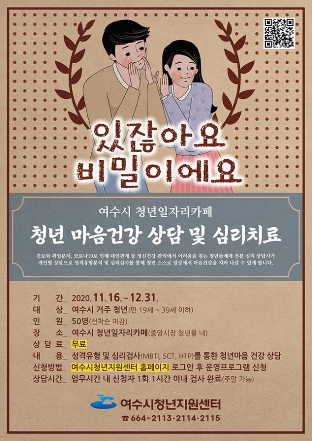 ±â°£Àº ¿À´Â 16ÀϺÎÅÍ 12¿ù ¸»±îÁöÀ̸ç, ½ÅûÀÚ Áß ¼±Âø¼ø 50¸í¿¡ ´ëÇØ ¿©¼ö½Ãû³âÁö¿ø¼¾ÅÍ(Áß¾Ó½ÃÀå 2Ãþ)¿¡¼ ¹«·á·Î ÇÑ ½Ã°£ °¡·® »ó´ãÀ» ÁøÇàÇÑ´Ù.