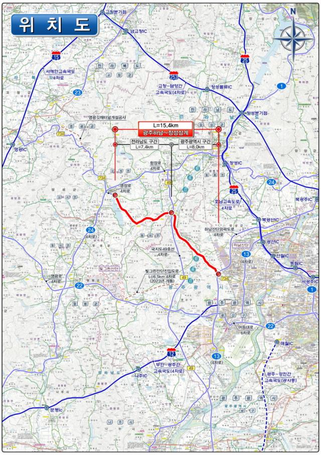 ±¤ÁÖ½Ã¿Í Àü³²µµ´Â ±¤Áֽà ±¤»ê±¸ Àå¼öµ¿ Àå¼ö±³Â÷·Î¿¡¼ °íºÀ·Î ÀÓ°îÀ» °ÅÃÄ À强±¸°£ Áö¹æµµ 734È£¼±À» µû¶ó ¼ö¾çÀú¼öÁö ¾Õ À强 »ó¹«ÆòȰø¿ø±îÁö 15.4§°(±¤ÁÖ 8§°, Àü³² 7.4§°) ±âÁ¸ 2Â÷·Î¸¦ 4Â÷·Î·Î È®ÀåÇϸç, ±ÞÄ¿ºê µî ÀϺΠ¼±ÇüÀÌ ºÒ·®ÇÑ ±¸°£Àº ¼±Çü°³·®ÀÌ ÀÌ·ç¾îÁø´Ù.