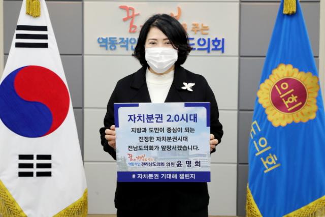 À±¸íÈñ ÀÇ¿øÀº Áö³ 20ÀÏ ¹®°æÈñ °æ±âµµÀÇȸ ºÎÀÇÀåÀ¸·ÎºÎÅÍ Áö¸íÀ» ¹Þ¾Æ ¡°ÁøÁ¤ÇÑ ÀÚÄ¡ºÐ±Ç½Ã´ë Àü³²µµÀÇȸ°¡ ¾ÕÀå¼°Ú½À´Ï´Ù¡±¶ó´Â ÆÖ¸»·Î Ä·ÆäÀÎÀ» °¡Á³´Ù.