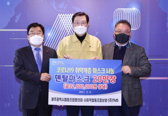 ÀÌ ÀÚ¸®¿¡¼ ±¤ÁÖ½ÃÇùµ¿Á¶ÇÕÇùÀÇȸ´Â Ãë¾à°èÃþÀÇ Äڷγª19 °¨¿° ¿¹¹æÀ» À§ÇØ ¸¶½ºÅ© 10¸¸ÀåÀ» (»ç)±¤ÁÖ±¤¿ª½ÃÀÚ¿øºÀ»ç¼¾ÅÍ¿¡ Àü´ÞÇß´Ù.