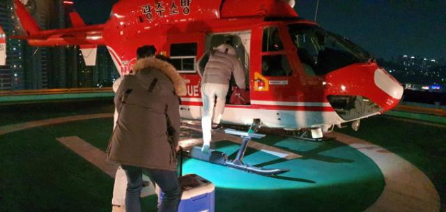 ±¤ÁÖ¼Ò¹æÇï±â´Â ÀûÃâ¼ö¼úÀÌ ÁøÇàµÇ´Â Á¶¼±´ëº´¿ø¿¡¼ ´ë±â ÈÄ ¿ÀÈÄ 7½Ã34ºÐ ÀÌ·úÇØ 1½Ã°£14ºÐ°£ÀÇ ¾ß°£(½Ã°è)ºñÇàÀ» ¸¶Ä¡°í ¿ÀÈÄ 8½Ã48ºÐ¿¡ ±âÁõ ½ÉÀåÀ» ¼¿ï »ï¼ºº´¿ø ÀÌ½ÄÆÀ¿¡ ¹«»çÈ÷ Àü´ÞÇß´Ù.