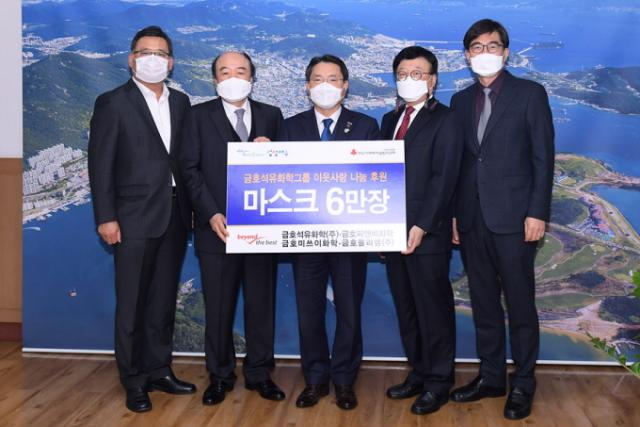 ¿©¼ö½Ã¿¡ µû¸£¸é Áö³ 19ÀÏ ±ÝÈ£¼®À¯ÈÇÐ(ÁÖ) ¼Û¼®±Ù ºÎ»çÀåÀ» ºñ·ÔÇØ ±ÝÈ£ÇǾغñÈÇÐ Á¤¿µÈ£ Àü¹«, ±ÝÈ£¹Ì¾²ÀÌÈÇÐ ¼Õ¿µ¿ø ºÎ»çÀå, ±ÝÈ£Æú¸®ÄÍ(ÁÖ) ÃÖ¿µ¼± °øÀåÀåÀÌ ¿©¼ö½Ãû ½ÃÀå½ÇÀ» ã¾Æ ±Ç¿ÀºÀ ¿©¼ö½ÃÀå¿¡°Ô Äڷγª19 ±Øº¹À» À§ÇÑ KF94 ¸¶½ºÅ© 6¸¸ÀåÀ» ÈÄ¿øÇÏ´Â Àü´Þ½ÄÀ» °¡Á³´Ù.