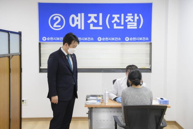 ¼øÃµ½Ã´Â À̳¯ ¿ÀÀü 9½Ã 30ºÐºÎÅÍ Áö¿ª 1È£ Á¢Á¾ÀÚÀÎ 40´ë ¿ä¾ç½Ã¼³ Àå±âÀÔ¼ÒÀÚ¸¦ ½ÃÀÛÀ¸·Î, ¿ä¾ç½Ã¼³ Á¾»çÀÚ µî¿¡ ´ëÇØ Äڷγª19 ¹é½ÅÀÎ ¾Æ½ºÆ®¶óÁ¦³×Ä«(AZ) Á¢Á¾À» ½Ç½ÃÇß´Ù. ÀÌ¿¡ µû¶ó ÇãÀ¯ÀÎ ÀÇÀåÀ» ºñ·ÔÇÑ ¼øÃµ½ÃÀÇȸ °ü°èÀÚµéÀº À̳¯ ¿ÀÀü º¸°Ç¼Ò¸¦ ã¾Æ, ¹é½Å Á¢Á¾ÀÌ ÀÌ·ç¾îÁö´Â »óȲÀ» ÁöÄѺ¸°í Á¢Á¾ ´ë»óÀÚµé°ú ÀÇ·áÁøµéÀ» °Ý·ÁÇß´Ù.