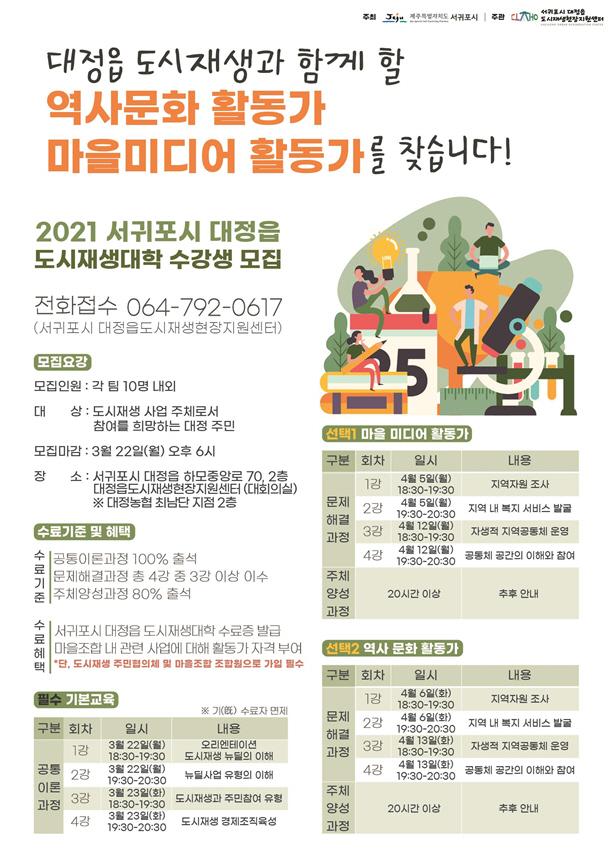 2021 ¼±ÍÆ÷½Ã ´ëÁ¤À¾ µµ½ÃÀç»ý´ëÇÐÀº ÁÖ¹ÎÇùÀÇü ½Å±Ôȸ¿ø ¹× ÀÏ¹Ý ÁÖ¹ÎÀ» ´ë»óÀ¸·Î Çϸç, ÁֹεéÀÌ µµ½ÃÀç»ý»ç¾÷À» ÀÌÇØÇϰí, Áö¼Ó °¡´ÉÇÑ »ç¾÷À» ÃßÁøÇÒ ¼ö ÀÖµµ·Ï ¸¶À» ¿ª»ç¹®È Ȱµ¿°¡¿Í ¸¶À»¹Ìµð¾î Ȱµ¿°¡ ¾ç¼ºÀ» ¸ñÀûÀ¸·Î ¿î¿µÇÑ´Ù. ¼ö°»ýµéÀº Çʼö ±âº»±³À°ÀÎ °øÅëÀ̷аúÁ¤À» ¸ÕÀú ¼ö·áÇÑ ÈÄ ¹®Á¦Çذá°úÁ¤ ¹× ÁÖü¾ç¼º±³À°¿¡ Âü¿©ÇÏ°Ô µÇ¸ç, 2021³â ÇϹݱâºÎÅÍ ½Ã¹ü ¿î¿µµÉ ´ëÁ¤À¾ ¿ª»ç¹®ÈÅõ¾îÀÇ ÇØ¼³»ç·Î Ȱµ¿Çϰųª, 2020³â 7¿ù °³±¹ÇÑ ¸¶À»¹æ¼Û±¹ ´ëÁ¤¸ù»ýÀÌTV Ȱµ¿°¡·Î Ȱµ¿ÇÒ ¼ö ÀÖµµ·Ï ½ÇÀü ±³À°À» ¹ÞÀ» ¿¹Á¤ÀÌ´Ù.
