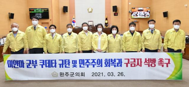 ¼Ò ÀÇ¿øÀº ¡°¹Ì¾á¸¶ ±¹¹ÎµéÀÇ ÀúÇ×À» Àû±Ø ÁöÁöÇÏ¸ç ¹Ì¾á¸¶ ±ººÎÀÇ ÇåÁ¤Áú¼ ÈѼհú ¹ÎÁÖÁÖÀÇ ÆÄ±«ÇàÀ§¿¡ °·ÂÈ÷ ±ÔźÇÑ´Ù¡±°í ¹ß¾ðÇÏ¿´À¸¸ç, ¹Ì¾á¸¶ Àü¿ª¿¡¼ ±º°æ¿¡ ÀÇÇØ ¹ß»ýÇϰí ÀÖ´Â À¯Ç÷»çÅ Áï°¢ Áߴܰú ±¸±ÝµÈ Á¤Ä¡ÀÎ ¹× °ü°èÀÚ µîÀÇ Á¶¼ÓÇÑ ¼®¹æÀ» Ã˱¸Çß´Ù. ¶ÇÇÑ, ´ëÇѹα¹ Á¤ºÎ¿¡¼´Â UN µî ±¹Á¦±â±¸¸¦ ºñ·ÔÇØ ±¹Á¦»çȸ¿ÍÀÇ °øµ¿´ëÀÀ°ú Çù·Â°È·Î ¹Ì¾á¸¶ ¹ÎÁÖÁÖÀÇ Áú¼È¸º¹À» À§ÇÑ ´Ù°¢Àû Á¶Ä¡¸¦ ½ÃÇàÇÒ °ÍÀ» Ã˱¸Çß´Ù. ³¡À¸·Î, ¹Ì¾á¸¶ÀÇ ¹ÎÁÖÁÖÀǰ¡ ½Â¸®ÇÏ´Â ³¯±îÁö ¿ÏÁÖ±ºÀÇȸ´Â ÁöÁö¸¦ º¸³¾ °ÍÀ» °áÀÇÇß´Ù.