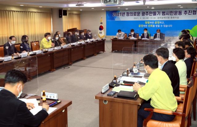±¤Áֽô 30ÀÏ ½Ãû ÁßȸÀǽǿ¡¼ ½Ã¹Î»çȸ´Üü, ÀÚ¿øºÀ»ç¼¾ÅÍ, À¯°ü±â°ü ´ëÇ¥ ¹× ÀÚÄ¡±¸ °ü°èÀÚ µî 34¸íÀÌ Âü¿©ÇÑ °¡¿îµ¥ ¡®Á¤ÀÇ·Î¿î ±¤ÁÖ¸¸µé±â ¹ü½Ã¹Î¿îµ¿ ÃßÁøÇùÀÇȸ¡¯¸¦ °³ÃÖÇß´Ù.