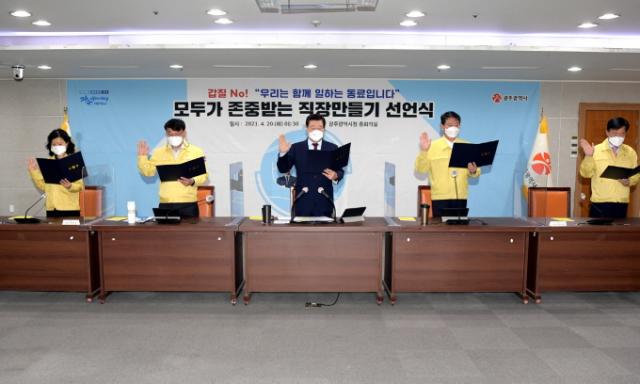 ±¤Áֽà °£ºÎ °ø¹«¿øµéÀº 20ÀÏ ½Ãû ÁßȸÀǽǿ¡¼ ¿¸° ¡®¸ðµÎ°¡ Á¸Áß¹Þ´Â Á÷À常µé±â ¼±¾ð½Ä¡¯¿¡¼ ¼±¾ð¹®À» ÅëÇØ ¡°¿ì¿ùÀû ÁöÀ§¸¦ ÀÌ¿ëÇÏ¿© °³ÀÎÀûÀÎ ¿ë¹« µî »çÀûÀÎ ÀÌÀÍÀ» Ãß±¸ÇÏÁö ¾Ê°í, Á÷¿øµéÀÇ ÀΰÝÀ̳ª ¿Ü¸ð ºñÇÏ¿Í Æø¾ð?ÆøÇà µî ¸ð¿åÀûÀÎ ¾ðÇàÀ» ÇÏÁö ¾Ê°Ú´Ù¡±¶ó°í ´ÙÁüÇϰí, ³»ºÎû·Åµµ Çâ»ó°ú °©Áú ±ÙÀýÀ» À§ÇÑ Á÷ÀåºÐÀ§±â Á¶¼º¿¡ ¾ÕÀå¼±â·Î Çß´Ù.
