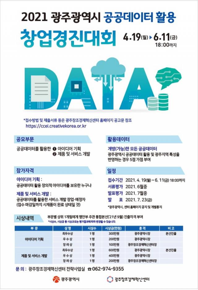 ±¤Áֽð¡ ÁÖÃÖÇϰí (Àç)±¤ÁÖâÁ¶°æÁ¦Çõ½Å¼¾ÅͰ¡ ÁÖ°üÇÏ´Â À̹ø â¾÷°æÁø´ëȸÀÇ °ø¸ðºÐ¾ß´Â ¾ÆÀ̵ð¾î ±âȹ°ú Á¦Ç° ¹× ¼ºñ½º °³¹ß 2°³ ºÎ¹®À¸·Î °ø°øµ¥ÀÌÅ͸¦ Ȱ¿ëÇÑ Ã¢ÀÇÀûÀÎ ¾ÆÀ̵ð¾î¸¦ º¸À¯ÇÑ ´©±¸³ª Âü°¡ÇÒ ¼ö ÀÖ´Ù.