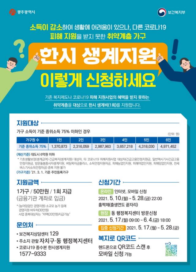 ±âÃÊ»ýȰº¸Àå(»ý°è±Þ¿©)¿Í ±ä±Þº¹Áö(»ý°èÁö¿ø) ´ë»óÀÚ, Ÿ Äڷγª19 ÇÇÇØÁö¿ø »ç¾÷ ´ë»óÀÚ´Â Áö¿ø ´ë»ó¿¡¼ Á¦¿ÜµÈ´Ù. ´Ü ±³À°ºÎ¿¡¼ Áö¿øÇÏ´Â ´ëÇлý ±Ù·ÎÀåÇÐ±Ý Áö¿ø ´ë»óÀº ±Ù·Î¿¡ ´ëÇÑ ±Þ¿© ¼º°ÝÀÎ ¸¸Å Çѽà »ý°èÁö¿ø±ÝÀ» Áߺ¹À¸·Î ¹ÞÀ» ¼ö ÀÖ´Ù. ±¤Áֽô »çÀü ¼ö¿äÁ¶»ç¸¦ ÅëÇØ 2¸¸8000¿©°¡±¸°¡ Çѽà »ý°èÁö¿ø±ÝÀ» ¹ÞÀ» ¼ö ÀÖÀ» °ÍÀ¸·Î ¿¹»óÇϰí ÀÖ´Ù. Áö¿ø±Ý ½ÅûÀº ¿Â¶óÀΰú ÇöÀ广¹®À» ÅëÇØ ÇÒ ¼ö ÀÖÀ¸¸ç, ¿Â¶óÀÎ ½ÅûÀº ¿À´Â 10ÀϺÎÅÍ 28ÀϱîÁö º¹Áö·Î(www.bokjiro.go.kr) ȨÆäÀÌÁö ¶Ç´Â ¸ð¹ÙÀÏ·Î Á¢¼ÓÇØ ½ÅûÇÏ¸é µÈ´Ù.