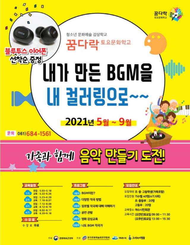 ²Þ´Ù¶ô Åä¿ä¹®ÈÇб³´Â ¡®³»°¡ ¸¸µç BGMÀ» ³» Ä÷¯¸µÀ¸·Î¡¯¶ó´Â ÁÖÁ¦·Î ¿À´Â 22ÀϺÎÅÍ 9¿ù 18ÀϱîÁö 4±â·Î ³ª´² ¸ÅÁÖ Åä¿äÀÏ ¿©¼ö½Ã¹Îȸ°ü¿¡¼ ¹«·á·Î ±³À°ÇÑ´Ù.