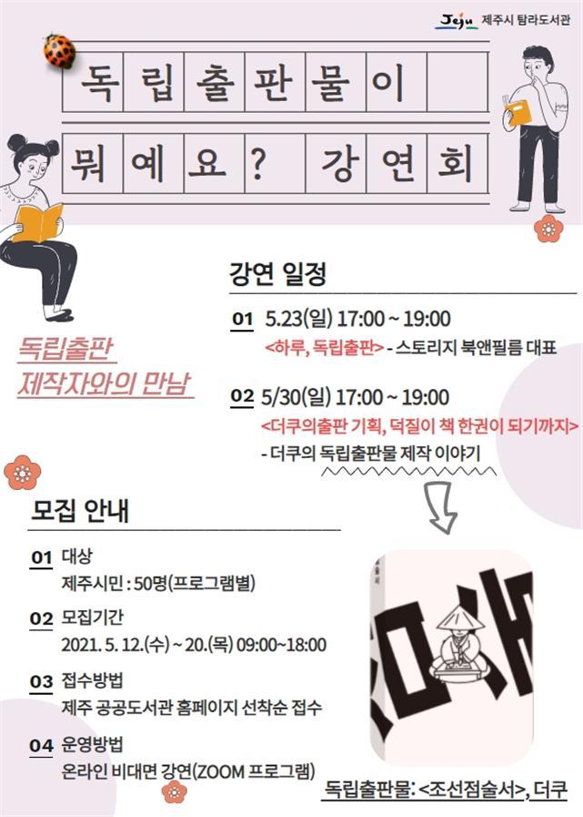 ÇØ´ç ÇÁ·Î±×·¥Àº ¸ðµÎ ¿Â¶óÀÎ(ZOOM) ºñ´ë¸éÀ¸·Î ÁøÇàµÇ¸ç, ½ÅûÀº ¿À´Â 5¿ù 20ÀϱîÁö °ø°øµµ¼°ü ȨÆäÀÌÁö(www.jeju.go.kr/lib)¿¡¼ ÇÁ·Î±×·¥º° 50¸í¾¿ ¼±Âø¼øÀ¸·Î Á¢¼öÇÒ ¼ö ÀÖ´Ù.