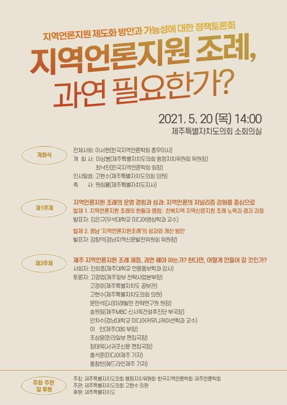 Á¦2ÁÖÁ¦¿¡¼´Â ¡®Á¦ÁÖ Áö¿ª¾ð·ÐÁö¿ø Á¶·Ê Á¦Á¤, °ú¿¬ ÇØ¾ß Çϴ°¡? ÇÑ´Ù¸é, ¾î¶»°Ô ¸¸µé¾î °¥ °ÍÀΰ¡?¡¯¸¦ ÁÖÁ¦·Î Á¾ÇÕÅä·ÐÀÌ ÀÌ·ç¾îÁø´Ù. ÁøÈñÁ¾ Á¦ÁÖ´ëÇб³ ¾ð·ÐÈ«º¸Çаú °»çÀÇ »çȸ·Î À̾îÁö¸ç, Åä·Ð¿¡´Â °í°æ¾÷(Á¦ÁÖÀϺ¸ Àü·«»ç¾÷º»ºÎ º»ºÎÀå), °í°æÈ£(Á¦ÁÖÆ¯º°ÀÚÄ¡µµ °øº¸°ü), °íÇö¼ö(Á¦ÁÖÆ¯º°ÀÚÄ¡µµÀÇȸ ÀÇ¿ø), ¹®¸¸¼®((»ç)¹Ì·¡¹ßÀü Àü·«¿¬±¸¿ø ¿øÀå), ¼Û¿øÀÏ(Á¦ÁÖMBC ½Å»ç¿Á°Ç¼³ÃßÁø´Ü ºÎ±¹Àå), ¾ÈÂ÷¼ö(°æ³²´ëÇб³ ¹Ìµð¾îÄ¿¹Â´ÏÄÉÀ̼ÇÇаú ±³¼ö), ÀÌÀÎ(Á¦ÁÖCBS ºÎÀå), Á¶»óÀ±(ÇѶóÀϺ¸ ÆíÁý±¹Àå), ÀåÅ¿í(¼±ÍÆ÷½Å¹® ÆíÁý±¹Àå), È«¼®ÁØ(¹Ìµð¾îÁ¦ÁÖ ±âÀÚ), ȫâºó(Çìµå¶óÀÎÁ¦ÁÖ ±âÀÚ) µîÀÌ Âü¿©ÇÑ´Ù.