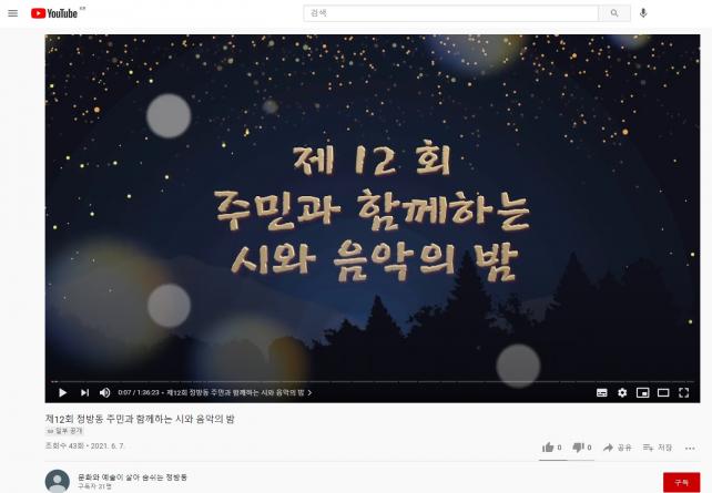 Á¤¹æµ¿(µ¿Àå ±èº¸Çù)°ú Á¤¹æµ¿ÁÖ¹ÎÀÚÄ¡À§¿øÈ¸(À§¿øÀå Çѵ¿Ã¶)¿¡¼´Â Áö³ 5¿ù 26ÀÏ ÀÌÁß¼·¹Ì¼ú°ü ¾ß¿Ü Àܵ𸶴翡¼ °³ÃÖÇÑ Áֹΰú ÇÔ²²ÇÏ´Â ¡¸½Ã¿Í À½¾ÇÀÇ ¹ã¡¹ ¿µ»óÀ» ÃÖ±Ù À¯Æ©ºê Á¤¹æµ¿ ä³Î¿¡ °ø°³Çß´Ù. ¿ÃÇØ·Î 12¹øÂ°¸¦ ¸Â´Â À̹ø Çà»ç´Â Äڷγª19 »çȸÀû °Å¸®µÎ±â·Î ÀÎÇÏ¿© ¸ðµç °ø¿¬Àº ¹«°üÁßÀ¸·Î ÁøÇàµÇ¾úÀ¸¸ç, °ø¿¬ÀÇ ¸ðµç °úÁ¤À» ¿µ»óÀ¸·Î ´ã¾Æ ¿Â¶óÀÎ °ø¿¬ ÇüÅ·ΠÀ¯Æ©ºê Á¤¹æµ¿ ä³Î¿¡ ¾÷·ÎµåµÇ¾ú´Ù. ƯÈ÷, Äڷγª19·Î ÀÎÇØ Èûµé¾úÀ» ¹®È¡¤¿¹¼úÀε鿡°Ô °ø¿¬ÀÇ ±âȸ¸¦ Á¦°øÇϰíÀÚ Ã⿬ÁøÀ» Áö¿ªÀÇ ¹®È¡¤¿¹¼úÀεé·Î ÃÊû¡¤±¸¼ºÇÏ¿© ´«±æÀ» ²ö´Ù. À̹ø °ø¿¬Àº ºñ°¡ ³»¸®´Â ³¯¾¾¿¡µµ ºÒ±¸Çϰí Á¤¹æµ¿ÀÇ ½Ã±×´Ïó ¹êµåÀÎ Á¤¹æ¹êµå¿Í Á¦ÁÖ °íÀ¯ÀÇ ¸ÚÀ» »ì¸° Á¤¹æÀÇ ÀÚ¶û ¹Î¼Óº¸Á¸È¸ÀÇ¡®¹°Çã¹÷ °ø¿¬¡¯À» ½ÃÀÛÀ¸·Î, °¨¹Ì·Î¿î ¿¬ÁÖ¿Í ³ë·¡, ±×¸®°í º½ ¹ã¿¡ ¾î¿ï¸®´Â ¾Æ¸§´Ù¿î ½Ã³¶¼ÛÀÌ ¾î¿ì·¯Áø °ø¿¬µé·Î ä¿öÁ³´Ù. ¶ÇÇÑ, ±×°£ Á¤¹æµ¿ÀÇ ½Ã¿Í À½¾ÇÀÇ ¹ãÀ» ÇÔ²² ÇØ¿Â ÀÌ»ýÁø ½ÃÀÎÀÇ ½Ã³¶¼Û°ú Á¤¹æµ¿ÁÖ¹ÎÀÚÄ¡À§¿øÈ¸¿Í ÀڸŰῬÁö¿ªÀÎ Á¾·Î 1~4°¡µ¿ ÁÖ¹ÎÀÚÄ¡À§¿øÈ¸ÀÇ ÃàÇÏÀλç¿Í Ưº°°ø¿¬µµ ¿µ»óÀ¸·Î ¸¸³ªº¼ ¼ö ÀÖ´Ù. Áö³ 2¿ùºÎÅÍ Çà»ç¸¦ ÁغñÇØ ¿Â Çѵ¿Ã¶ À§¿øÀåÀº¡°Äڷγª19·Î ÀÎÇÏ¿© ¸ðµç °ÍÀÌ Á¶½É½º·¯¿î ½Ã±â¿¡ ÇàÇØÁø ¹®È°ø¿¬ÀÎ ¸¸Å ÇöÀåÀÇ ¹æ¿ª¼öÄ¢À» öÀúÈ÷ ÁؼöÇÏ¿© ÃÔ¿µÇÏ¿´À¸¸ç, ¾ÕÀ¸·Î ¸¹Àº ºÐµéÀÌ ¿Â¶óÀÎ °ø¿¬ÀåÀ» ã¾Æ¿Í µû¶æÇÑ À§·ÎÀÇ ½Ã°£À» °¡Áú ¼ö Àֱ⸦ ¹Ù¶õ´Ù¡±°í ¹àÇû´Ù.