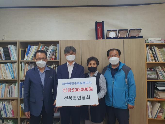 Çѱ¹¹®ÀÎÇùȸ ÀüºÏÁöȸ ±è¿µ ȸÀåÀº ȸ¿øµéÀ» ÅëÇØ ¸ð±ÝµÈ 50¸¸¿øÀ» Àü´ÞÇÏ¸ç ¡°¹Ì¾á¸¶ ¹ÎÁÖȸ¦ ÁöÁöÇϰí ÇϷ绡¸® ÆòȰ¡ Á¤ÂøµÇ±æ ¼Ò¸ÁÇÑ´Ù¡±°í ¹àÇû´Ù.