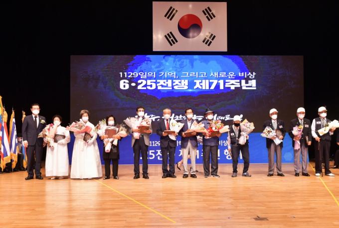 ƯÈ÷, À̳¯ ±â³ä½Ä¿¡¼´Â 1952³â 10¿ù °¿øµµ öÀÇ »ï°¢Áö´ë ±ÝÈÁö±¸ ÀüÅõ¿¡¼ ¹ß±ºÀÇ ¹«°øÀ¸·Î 1953³â 9¿ù ¼ÈÆ °áÁ¤µÆ´ø ±¤ÁÖÃâ½Å ÀüÀï À¯°øÀÚ Íº ±èÀÏ¿µ ÁßÀ§(À°±º ¼öµµ»ç´Ü)¿¡ ´ëÇÑ ±Ý¼ºÃ湫¹«°øÈÆÀåÀ» À̿뼷 ½ÃÀåÀÌ 68³â ¸¸¿¡ À¯Á·ÀÎ Àå³² ±è±Õ¼ö(65) ¾¾¿¡°Ô Àü¼öÇß´Ù.