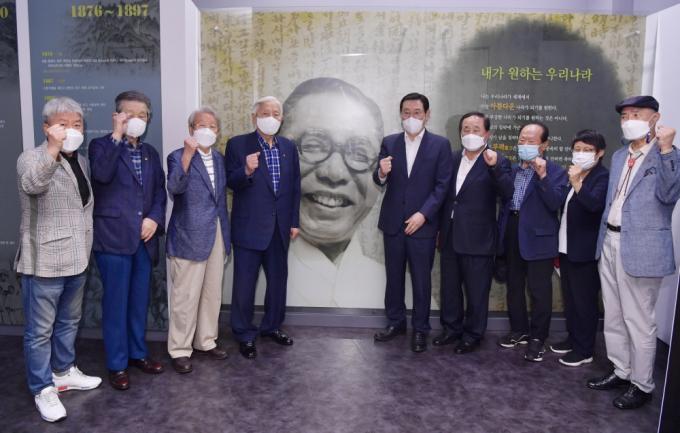 ±¤ÁÖ¹é¹ü±â³ä°üÀº 1946³â ¹é¹ü ±è±¸¼±»ýÀÌ ±¤Áֹ湮 Áß ±¤º¹ ÈÄ ±Í±¹ÇÑ µ¿Æ÷µéÀÌ ±¤ÁÖõº¯¿¡ õ¸·À» Ä¡°í »ýȰÇÏ´Â ¸ð½ÀÀ» º¸°í ±âÁõÇÑ ÈÄ¿ø±ÝÀ¸·Î Á¶¼ºµÈ ¸¶À»¿¡ À§Ä¡ÇØ Çß´Ù.