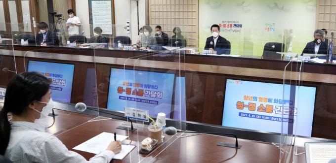 Äڷγª19 ÀÌÈÄ ÇÑÀÚ¸®¿¡ ¸ðÀÏ ±âȸ°¡ ¾ø¾î ¾Æ½¬¿öÇÏ´ø û³âµéÀº °£´ãȸ¸¦ ÅëÇØ ÀÏÀÚ¸®, ¹®È, º¹Áö µî û³âÁ¤Ã¥ Çö¾È¿¡ ´ëÇØ ±è Áö»ç¿Í ´Ù¾çÇÑ ÀǰßÀ» ÁÖ°í¹Þ¾Ò´Ù. ƯÈ÷ û³â â¾÷ Áö¿ø±â°£ È®´ë, û³â¼Ò³ó Áö¿ø´ëÃ¥ ¸¶·Ã, ³óÃÌÁö¿ªÀÇ ¹®È ÇâÀ¯±âȸ ÁõÁø, ¾ÈÁ¤µÈ û³âÀÏÀÚ¸® »ç¾÷ È®´ë ¹æ¾È µî ´Ùä·Î¿î Á¦¾ÈµéÀÌ À̾îÁ³´Ù.