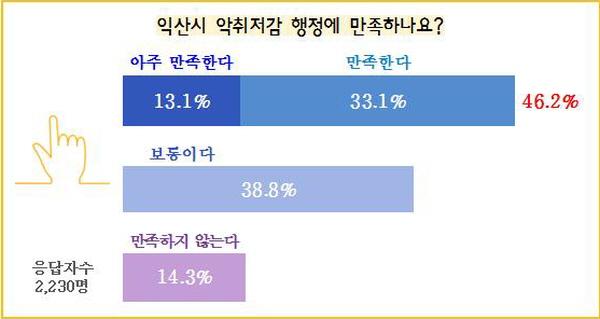 ¾ÇÃë ÇàÁ¤¿¡ ´ëÇÑ ¸¸Á·µµ´Â ÀÀ´äÀÚÀÇ 46.2%°¡ ¡®¾ÆÁÖ ¸¸Á·ÇÑ´Ù¡¯ ¶Ç´Â ¡®¸¸Á·ÇÑ´Ù¡¯°í ´äÇß°í ¡®¸¸Á·ÇÏÁö ¾Ê´Â´Ù¡¯´Â 14.3%·Î ³ª¿Í, ½Ã¿¡¼ ÃßÁø ÁßÀÎ ¾ÇÃë ÇàÁ¤¿¡ ½Ã¹Î »ó´ç¼ö°¡ ±àÁ¤ÀûÀÎ ¹ÝÀÀÀ» º¸À̰í ÀÖÀ½À» È®ÀÎÇÒ ¼ö ÀÖ¾ú´Ù.