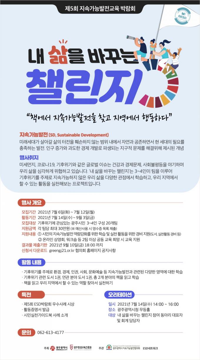 Âü°¡ ½Ã¹ÎµéÀº ±âÈÄÀ§±â °ü·Ãµµ¼¿Í ¿¬°ü ºÐ¾ß µµ¼¸¦ ÀÐ°í ¿ì¸® Áö¿ª¿¡¼ ÇÒ ¼ö Àִ Ȱµ¿À» ã¾Æ¼ ½ÇõÇÏ´Â ÇÁ·Î±×·¥À» ¼öÇàÇÏ°Ô µÈ´Ù. ÇâÈÄ Áö¼Ó°¡´É¹ßÀü±³À°(ESD) ÇÁ·Î±×·¥ È®»ê°ú º¸±ÞÀ» À§ÇØ Âü°¡ÆÀÀ» ´ë»óÀ¸·Î ¿ì¼ö»ç·Ê ½Ã»ó ¹× ½Ã¹Î½Çõ °¡À̵åºÏ ¹ß°£ÇÒ °èȹÀÌ´Ù.