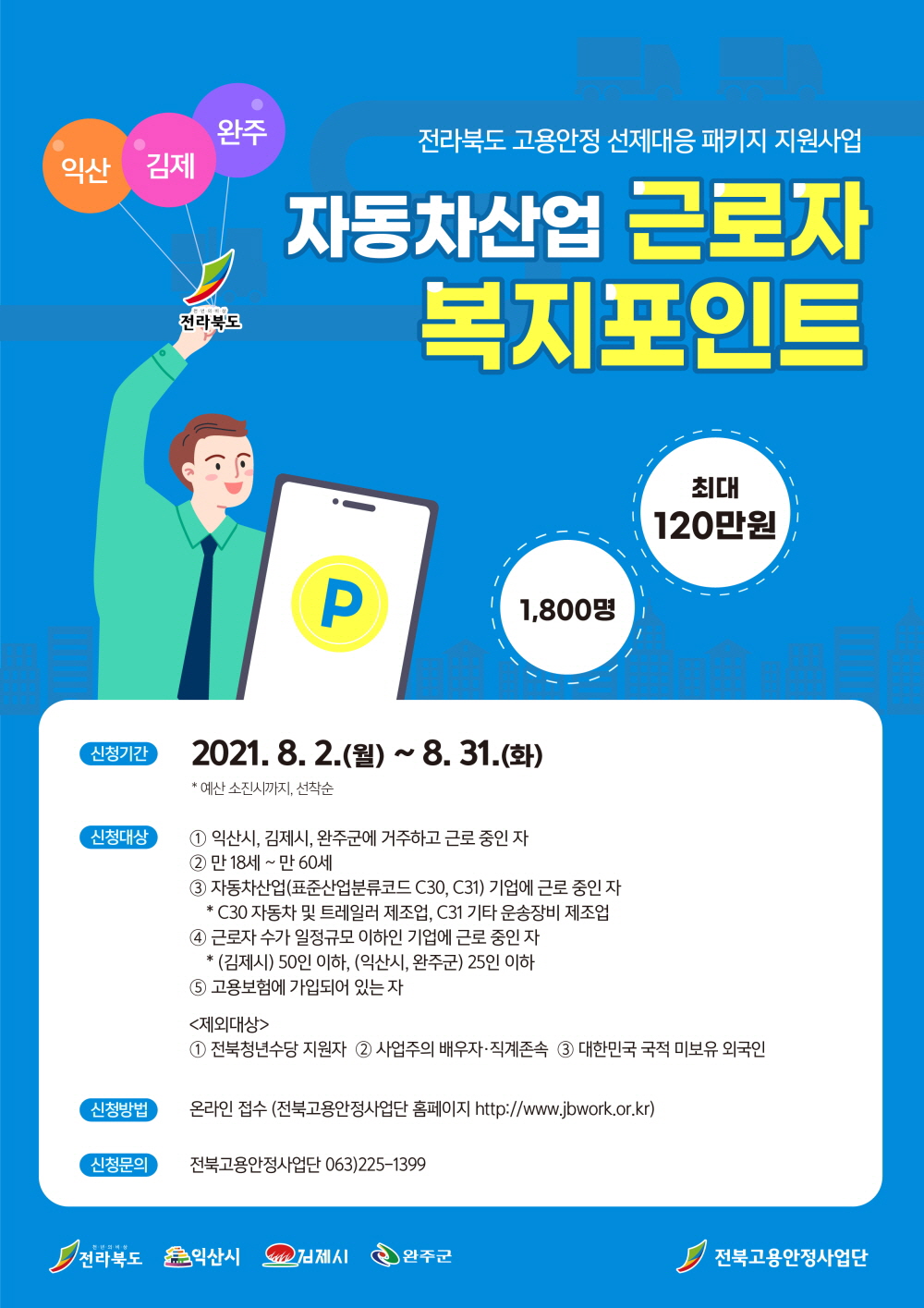 ¿ÃÇØ 21¾ï ¿øÀ» ÅõÀÔÇØ ÀÍ»ê, ±èÁ¦, ¿ÏÁÖ Áö¿ªÀÇ ÀÚµ¿Â÷ °ü·Ã±â¾÷ ±Ù·ÎÀÚ¿¡ ÃÖ´ë 120¸¸ ¿øÀÇ º¹ÁöÆ÷ÀÎÆ®¸¦ Áö¿øÇÑ´Ù. 9¿ùºÎÅÍ 3°³ ½Ã±º °¢ 600¿© ¸í, ÃÑ 1,800¸í¿¡°Ô ¸Å ºÐ±âº° 30¸¸ ¿øÀ» Áö¿ª»ç¶ûÄ«µå·Î Áö±ÞÇÑ´Ù.