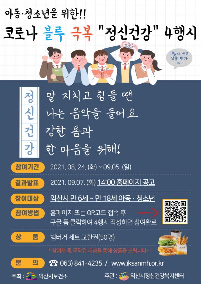 ¡®Á¤½Å°Ç°¡¯ 4Çà½Ã Áþ±â Ä·ÆäÀÎÀº ÀÍ»ê½Ã ¸¸ 6¼¼ºÎÅÍ ¸¸18¼¼ ÀÌÇÏÀÇ ¾Æµ¿ û¼Ò³âÀÌ¸é ´©±¸³ª Âü¿©ÇÒ ¼ö ÀÖ´Ù. ÀÍ»ê½ÃÁ¤½Å°Ç°º¹Áö¼¾ÅÍ È¨ÆäÀÌÁö ¹æ¹® ¹× SNS(ÀνºÅ¸±×·¥, ÆäÀ̽ººÏ µî) QRÄڵ带 ÅëÇØ »çÀÌÆ®¿¡ Á¢¼ÓÇØ¡°Á¤½Å°Ç°¡±À¸·Î 4Çà½Ã¸¦ Áö¾î ÀÔ·ÂÇÏ¸é µÈ´Ù. Âü¿©ÀÚ¿¡°Ô´Â ¹«ÀÛÀ§ Ãß÷À» ÅëÇØ ÃÑ 50¸í¿¡°Ô ¸ð¹ÙÀÏ ±³È¯±ÇÀ» Á¦°øÇÒ ¿¹Á¤ÀÌ´Ù.
