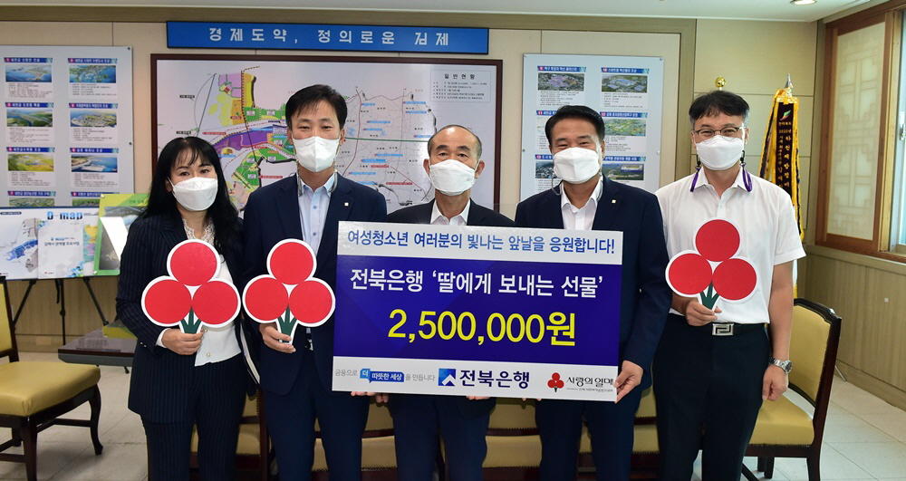 À̳¯ Àü´Þ½Ä¿¡´Â ÀüºÏÀºÇà ÀÓÀç¿ø ºÎÇàÀå µî °ü°èÀÚ°¡ Á÷Á¢ Âü¿©ÇÏ¿´À¸¸ç, ¿©¼º û¼Ò³âÀ» À§ÇÑ ¼±¹°²Ù·¯¹Ì(»ý¸®´ë ¹× ¹°Æ¼½´ µîÀ¸·Î ±¸¼ºµÈ º¸°ÇÀ§»ý¿ëǰ) 100»óÀÚ(250¸¸¿ø »ó´ç)¸¦ Àü´ÞÇÏ¿´´Ù.