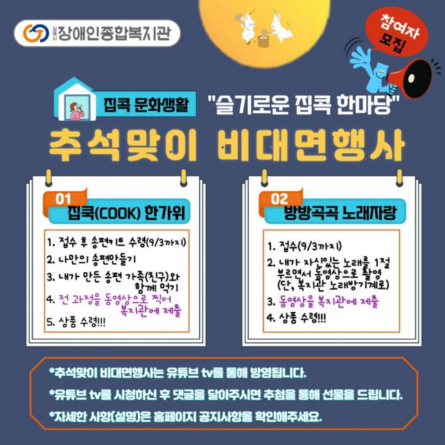 ¡°½½±â·Î¿î ÁýÄÛ ÇѸ¶´ç¡± Çà»ç´Â À¯Æ©ºê ä³Î(±èÁ¦½ÃÀå¾ÖÀÎÁ¾ÇÕº¹Áö°ü TV)À» ÅëÇØ ´©±¸³ª º¼ ¼ö ÀÖµµ·Ï ¹æ¿µÇÒ ¿¹Á¤À̸ç, Ãß¼® ¸íÀý¿¡ °¡Á·µéÀÌ ÇÔ²² ¸ð¿© ½Ãû ÈÄ ´ñ±ÛÀ» ´Þ¸é Ãß÷À» ÅëÇØ ǪÁüÇÑ »óǰ(6¸í 2¸¸¿ø ġŲÄíÆù, 12¸í 1¸¸¿ø Ä«ÆäÄíÆù)µµ Áö±ÞÇÒ °èȹÀÌ´Ù.