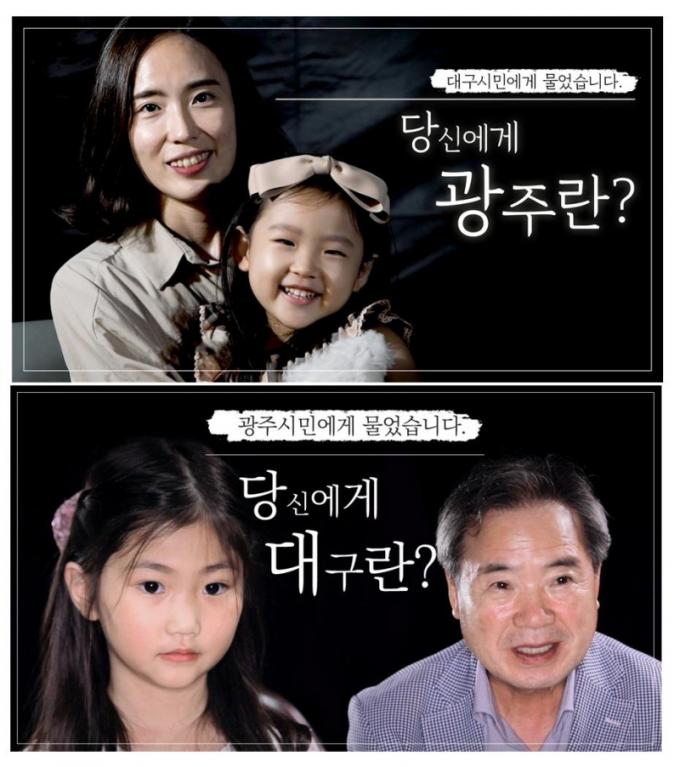 À¯¾Æ, Çлý, ÁÖºÎ, ÀÚ¿µ¾÷ÀÚ, Åýñâ»ç, ȸ»ç¿ø µî °¢°è°¢Ãþ ±¤ÁÖ¡¤´ë±¸ ½Ã¹ÎÀÌ Âü¿©ÇÑ À̹ø ¿µ»óÀº ¡®´ç½Å¿¡°Ô ´ë±¸´Â?¡¯, ¡®´ç½Å¿¡°Ô ±¤ÁÖ´Â?¡¯À̶ó´Â Áú¹®¿¡ 5‧18¹ÎÁÖȿ, 2‧28´ë±¸¹ÎÁÖȿ, ±¹¸³¾Æ½Ã¾Æ¹®ÈÀü´ç, ±è±¤¼®´Ù½Ã±×¸®±â±æ µî ¿ª»ç, ÁÖ¿ä °ü±¤Áö, À½½Ä µî ÀڽŵéÀÌ °æÇèÇß°í ±â¾ïÇÏ´Â ±¤ÁÖ¿Í ´ë±¸¸¦ ¶°¿Ã¸®¸ç ¾ç µµ½ÃÀÇ À̹ÌÁö¸¦ Áø¼ÖÇÏ°Ô ´äÇÏ´Â ÀÎÅͺä Çü½ÄÀ¸·Î Á¦À۵ƴÙ.