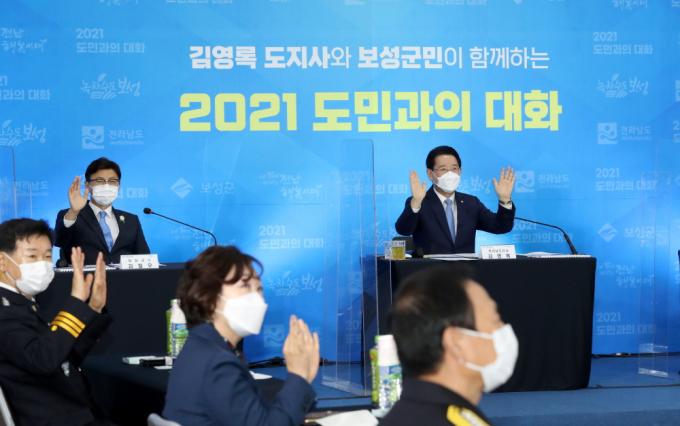 À̳¯ µµ¹Î°úÀÇ ´ëÈ¿¡´Â Äڷγª19 ¹æ¿ªÀ» À§ÇØ ±è¿µ·Ï Áö»ç¿Í ±èö¿ì º¸¼º±º¼ö, ±èÀçö º¸¼º±ºÀÇȸ ÀÇÀå, ÀÓ¿µ¼ö¡¤À̵¿Çö Àü³²µµÀÇ¿ø µî 11¸í¸¸ ÇöÀå Âü¼®Çß´Ù. ±º¹Î 150¸íÀº ¿Â¶óÀÎ È»óȸÀÇ·Î Âü¿©Çß´Ù.