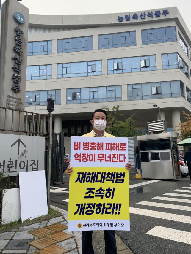 ÀüºÏµµÀÇȸ ÃÖ¿µÀÏ(¼øÃ¢¡¤´õºÒ¾î¹ÎÁÖ´ç) ÀÇ¿øÀº 19ÀÏ ¿ÀÀü 7½ÃºÎÅÍ ³ó¸²Ãà»ê½ÄǰºÎ ¾Õ¿¡¼ ¡°µµ³» Àüü ³íº 5¸¸2,424§µ°¡·®ÀÌ º´ÃæÇØ¿¡ ½Ã´Þ¸®´Â °ÍÀ¸·Î Áý°èµÆ´Ù¡±¸é¼ ¡°ÇÏÁö¸¸, ³ó¾÷ÀçÇØ·Î ÀÎÁ¤¹ÞÁö ¸øÇÏ´Â ÇöÇà Á¦µµ ¶§¹®¿¡ ³ó¹ÎµéÀÌ ½Ã¸§À» ¾Î°í ÀÖ´Ù¡±°í °ÇÑ ¸ñ¼Ò¸®¸¦ ³»¸ç 1ÀÎ ½ÃÀ§¸¦ ÁøÇàÇß´Ù.