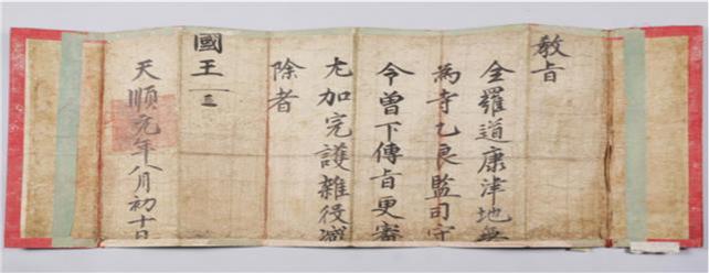 °Áø ¹«À§»ç °¨¿ª±³Áö´Â Àýøº» ÇüÅ·Π°³ÀåÇÏ¿´À¸¸ç º¸Á¸»óŰ¡ ¸Å¿ì ¾çÈ£ÇÑ °ÍÀ¸·Î ¹àÇôÁ³´Ù. ƯÈ÷ ¼¼Á¶ÀÇ ¾î¾Ð(åÙäã : ÀÓ±ÝÀÇ ¼ö°áÀ» »õ±ä µµÀå)°ú ¡®½Ã¸íÁö¸ð(ã¿Ù¤ñýÜÄ : Á¶¼±½Ã´ë¿¡ Ã¥ºÀÀ̳ª º½½À» ³»¸± ¶§ »ç¿ëÇÑ µµÀå)¡¯ÀÇ ¾îº¸°¡ ¸íÈ®ÇÏ°Ô ³²¾ÆÀÖ´Â Á¶¼± ÃÊ±â °í¹®¼·Î, ±¹°¡¹®¼ ¾ç½Ä ¿¬±¸¸¦ À§ÇÑ ±ÍÁßÇÑ ÀÚ·á·Î Æò°¡µÈ´Ù.