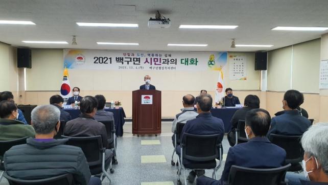 ù ³¯ °³ÃÖµÈ ¹é±¸¸é ½Ã¹Î°úÀÇ ´ëÈ´Â »çȸ´ÜüÀå µî ÁֹΠ50¿©¸íÀÌ Âü¼®ÇÑ °¡¿îµ¥ ¹Î¼±7±â ÁÖ¿ä½ÃÃ¥ ¼³¸í°ú ¸é ÁÖ¿ä¾÷¹« º¸°í ÈÄ ½Ã¹Î°úÀÇ ´ëȸ¦ ¹ÚÁØ¹è ½ÃÀåÀÌ Á÷Á¢ ÁÖ°üÇϸç Áֹεé°ú ÁúÀǤýÀÀ´ä ½Ã°£À» °®´Â ¼øÀ¸·Î ÁøÇàµÇ¾ú´Ù.