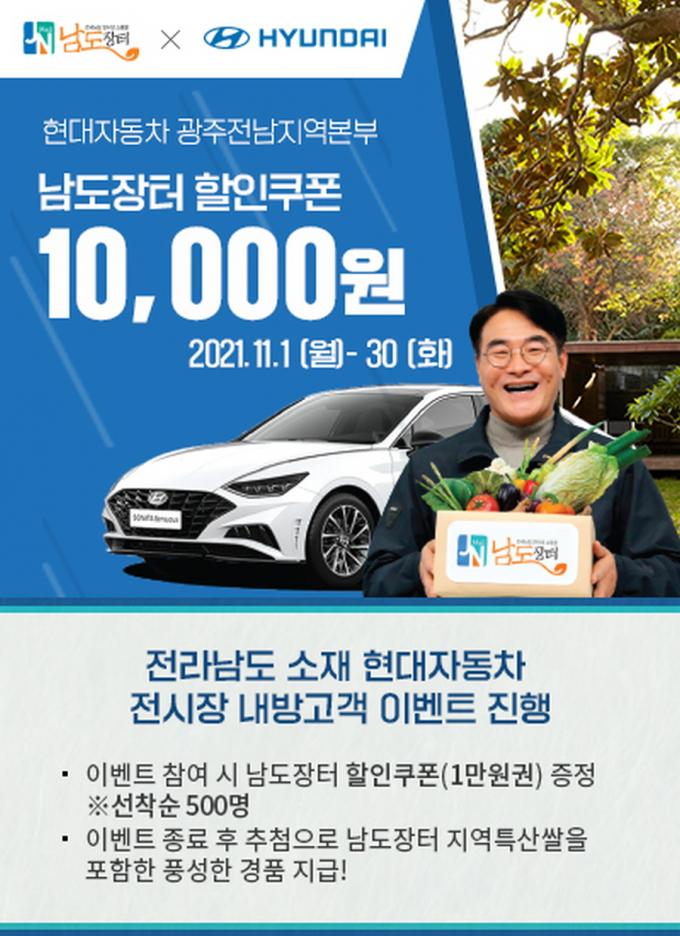 Çö´ëÀÚµ¿Â÷ ±¤ÁÖÀü³²Áö¿ªº»ºÎ´Â À̺¥Æ® ±â°£ Àü³²±Ç 33°³ Àü½ÃÀå¿¡ ¹æ¹®ÇÑ °í°´ Áß ¼±Âø¼ø 500¸í¿¡°Ô ³²µµÀåÅÍ 1¸¸ ¿ø ÇÒÀÎÄíÆùÀ» Á¦°øÇÑ´Ù. ÇÒÀÎÄíÆù À¯È¿±â°£Àº 12¿ù 5ÀϱîÁö´Ù.