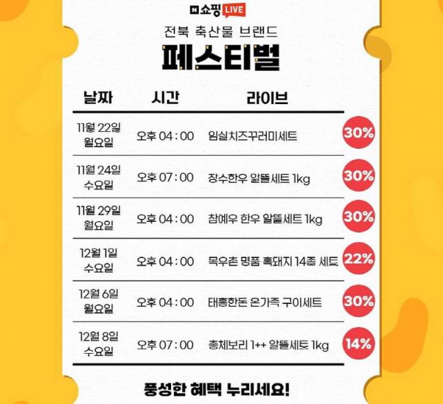 ´ÙÀ½ ´Þ 1ÀÏ 16½Ã¿¡´Â ³óÇù¸ñ¿ìÃÌ ¸íǰ ÈæµÅÁö 14Á¾ ¼¼Æ®, 6ÀÏ 16½Ã¿¡´Â ÅÂÈïÇѵ· ¿Â°¡Á· ±¸À̼¼Æ®, 8ÀÏ 19½Ã¿¡´Â ÃÑüº¸¸® 1++ ¾Ë¶ã¼¼Æ®¸¦ ÇÒÀÎ ÆÇ¸ÅÇÑ´Ù. À̹ø Çà»ç´Â ¶óÀ̺ê¼îÇÎÀ¸·Î ¹æ¼Û Áß¿¡¸¸ ÇÒÀÎµÈ °¡°ÝÀ¸·Î ÁøÇàµÈ´Ù.