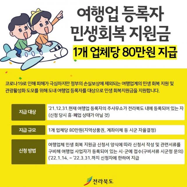 11ÀÏ ÀüºÏµµ´Â ¡¸¿©Çà¾÷°è ¹Î»ýȸº¹ Áö¿ø±Ý¡¹À» ¸¶·ÃÇØ 14ÀϺÎÅ͵µ³» ¿©Çà»ç¿¡ 80¸¸ ¿ø¾¿À» Áö±ÞÇÑ´Ù°í ¹àÇû´Ù. ÀÌ´Â Äڷγª19 Àå±âÈ·Î °æ¿µ³À» °Þ°í ÀÖÁö¸¸, Á¤ºÎÀÇ ¼Õ½Çº¸»ó ´ë»ó¿¡¼ Á¦¿ÜµÅ Áö¿ø »ç°¢Áö´ë¿¡ ÀÖ´Â ¿©Çà¾÷°èÀÇ °æ¿µÈ¸º¹°ú °ü±¤»ê¾÷ Ȱ¼ºÈ¸¦ À§Çؼ´Ù.