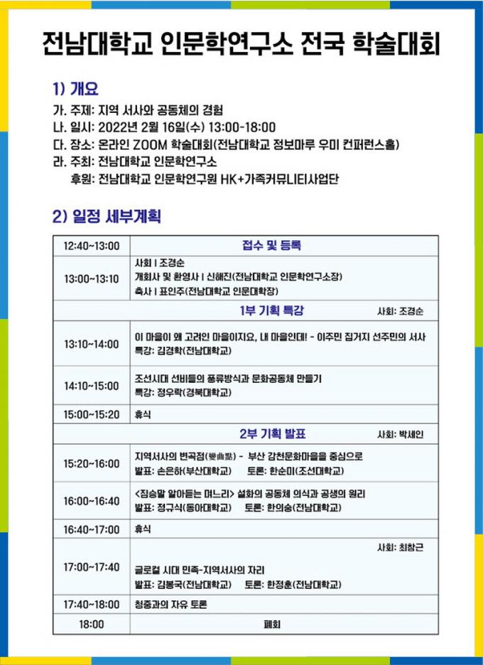 Àü³²´ë Àι®Çבּ¸¼Ò(¼ÒÀå ½ÅÇØÁø ±³¼ö)´Â ¿À´Â 2¿ù 16ÀÏ ¿ÀÈÄ 1½Ã Àü³²´ë Á¤º¸¸¶·ç ¿ì¹ÌÄÁÆÛ·±½º Ȧ¿¡¼ ¡®Áö¿ª ¼»ç¿Í °øµ¿Ã¼ÀÇ °æÇ衯À̶ó´Â ÁÖÁ¦·Î ¡¸2022³â Àü±¹Çмú´ëȸ¡¹¸¦ °®´Â´Ù. Çмú´ëȸ´Â ¿Â¶óÀÎ(ZOOM)À» ÀÌ¿ëÇØ µ¿½Ã¿¡ ÁøÇàµÈ´Ù.