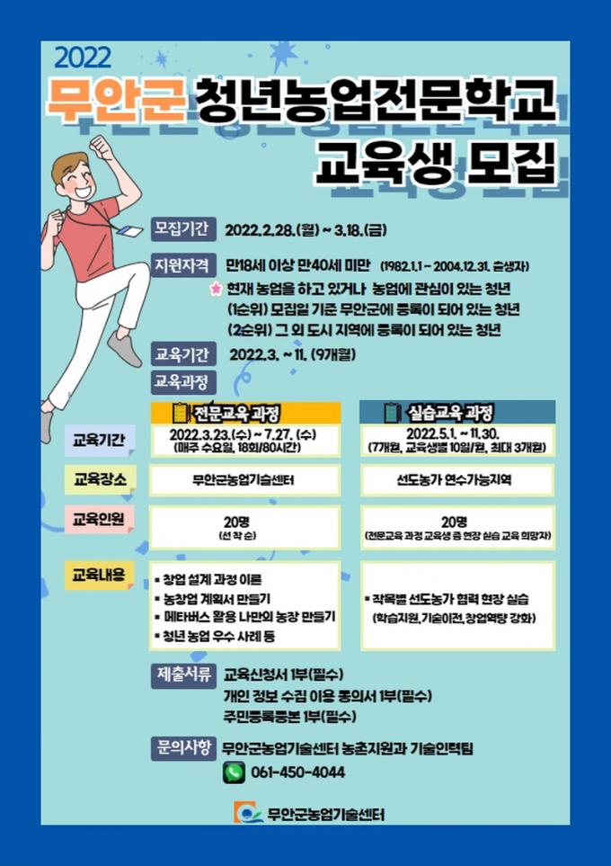 ¿ÃÇØ ¹«¾È±ºÀÌ »õ·Î °³¼³ÇÑ Ã»³â³ó¾÷Àü¹®Çб³´Â 20¸íÀÇ ±³À°»ýÀ» ´ë»óÀ¸·Î 3¿ùºÎÅÍ 11¿ù±îÁö 9°³¿ù°£ ¿î¿µµÇ¸ç, Áö¿ø ÀÚ°ÝÀº ¸¸ 39¼¼ ÀÌÇÏÀÇ ¹«¾È±º °ÅÁÖ Ã»³âÀ̳ª Ÿ Áö¿ª µµ½Ã û³âÀÌ´Ù.