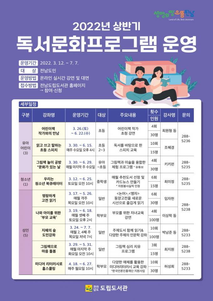 ¼ºÀÎ ´ë»óÀ¸·Î´Â ½É¸® Ä¡À¯, µ¶¼ Åä·Ðȸ, °íÀü¹®ÇÐ ÇÔ²² Àбâ, ã¾Æ°¡´Â ºÏ ÄܼƮ, ¹Ìµð¾î Æò»ý±³½Ç, ÁöÇýÀÇ ½£ µµ¹Î °ÁÂ, ±æÀ§ÀÇ Àι®ÇÐ, ³ª¿Í ¾ÆÀ̸¦ À§ÇÑ ºÎ¸ð±³À°, ÀÚÁ¸°¨ÀÌ ÀÚ¶ó´Â µ¶¼¿©Çà µî 18°³ °Á¸¦ ¿î¿µÇÑ´Ù.