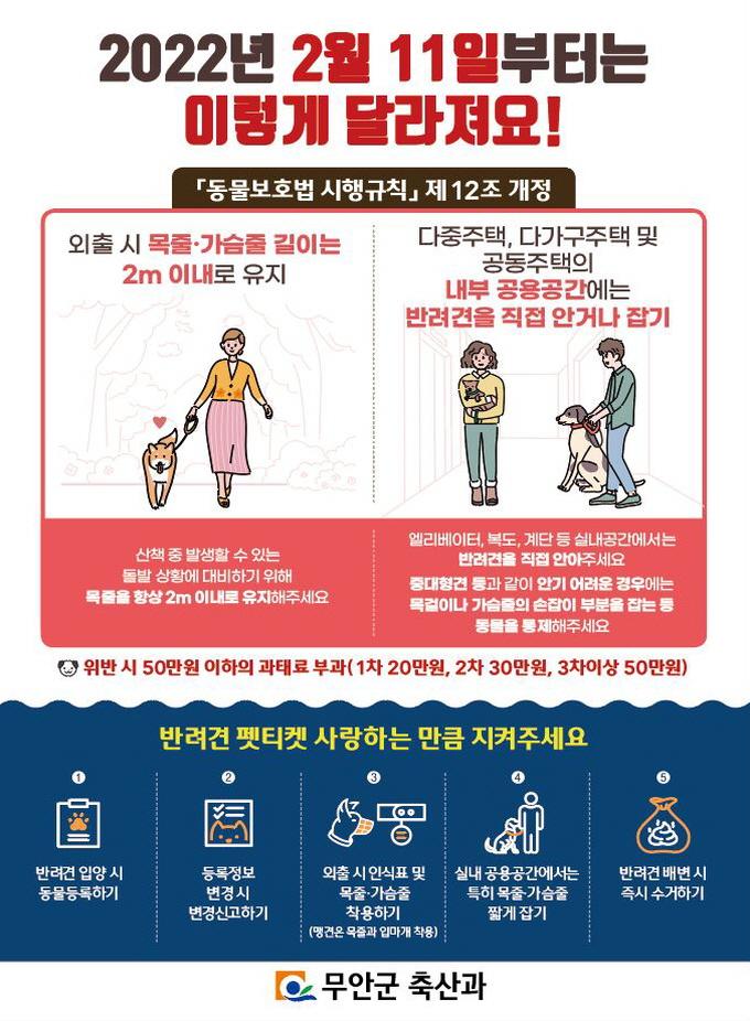 ÁÖ¿ä È«º¸³»¿ëÀº °³Á¤µÈ µ¿¹°º¸È£¹ý ½ÃÇà±ÔÄ¢¿¡ µû¶ó ¹Ý·Á°ß°ú ¿ÜÃ⠽à ¸ñÁÙ¡¤°¡½¿ÁÙ ±æÀ̸¦ 2m À̳»·Î À¯ÁöÇϱâ, °øµ¿ÁÖÅᤴٰ¡±¸ÁÖÅà ³»ºÎ °ø¿ë°ø°£¿¡¼´Â ¹Ý·Á°ßÀ» Á÷Á¢ ¾È°Å³ª Àâ±â µîÀÌ´Ù.